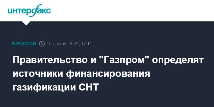 Москва. 19 апреля. INTERFAX.RU - Правительству РФ совместно с "Газпромом" предстоит определить источники финансирования программы газификации садоводческих некоммерческих товариществ (СНТ), находящихся в газифицированных населенных пунктах, сообщил глава "Газпром Межрегионгаза" Сергей Густов на встрече со студентами Российского госуниверситета нефти и газа.