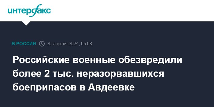 Москва. 20 апреля. INTERFAX.RU - Саперы группировки войск "Центр" обезвредили несколько тысяч неразорвавшихся боеприпасов вооруженных сил Украины в Авдеевке, сообщило Минобороны РФ.