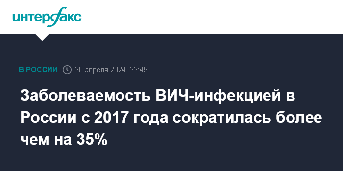 Москва. 20 апреля. INTERFAX.RU - Показатель заболеваемости ВИЧ-инфекцией в России с 2017 года уменьшился на 36% и по итогам прошлого года составил 37,3 случая на 100 тыс. населения, сообщается в докладе об итогах работы Минздрава РФ в 2023 году.