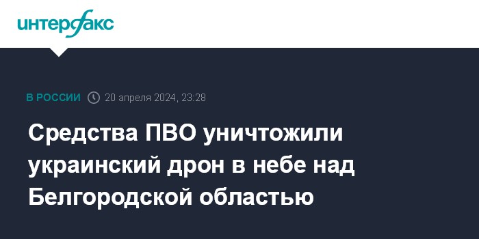 Москва. 20 апреля. INTERFAX.RU - Российские военные сообщили в субботу, что средства противовоздушной обороны уничтожили украинский беспилотник самолетного типа над Белгородской областью.