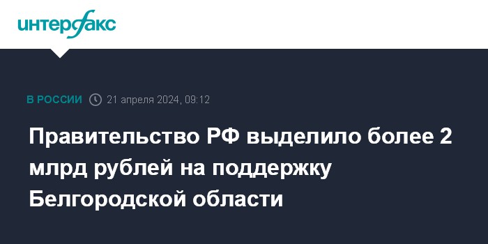 Москва. 21 апреля. INTERFAX.RU - Белгородская область получит из резервного фонда Правительства РФ более 2 млрд рублей на поддержку бизнеса и жителей региона, пострадавших от украинских атак, сообщил губернатор Вячеслав Гладков.