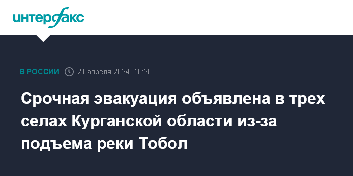 Москва. 21 апреля. INTERFAX.RU - Жителям ряда населенных пунктов Белозерского округа Курганской области необходимо срочно эвакуироваться из-за подъема реки Тобол, сообщает окружная администрация в телеграм-канале в воскресенье.