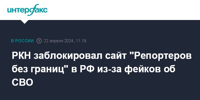Накануне стало известно о блокировке в РФ сайта организации. Согласно данным универсального сервиса РКН по проверке блокировок в РФ страниц и сайтов, в России ограничен доступ к ресурсу международной неправительственной организации "Репортеры без границ" - rsf.org. По чьему требованию происходит блокировка, указано не было.
