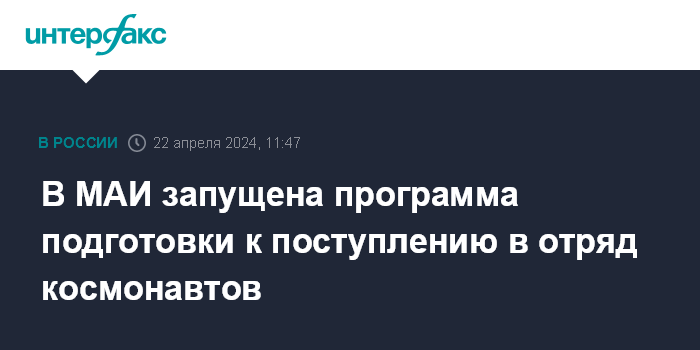 Москва. 22 апреля. INTERFAX.RU - Центр подготовки космонавтов (ЦПК) имени Гагарина и Московский авиационный институт (МАИ) в рамках сотрудничества запустили первую в России программу подготовки к поступлению в отряд космонавтов, передает корреспондент "Интерфакса".