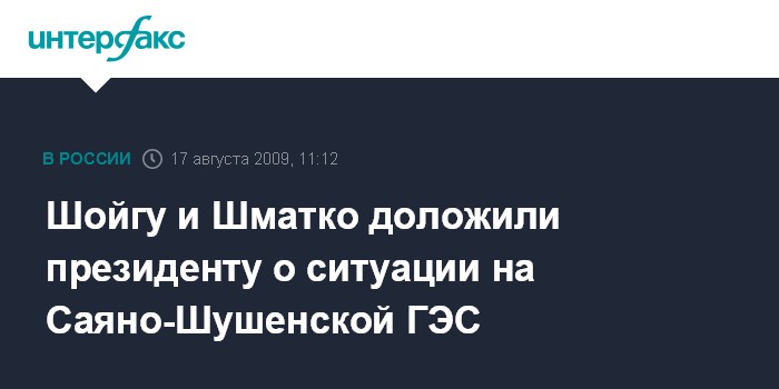 Как сообщили "Интерфаксу" в понедельник в пресс-службе главы государства, министр энергетики Сергей Шматко, в свою очередь, доложил президенту РФ о мерах, предпринимаемых подчиненными ему службами по ликвидации последствий аварии на Саяно- Шушинской ГЭС и восстановлению штатного режима работы энергосистемы Сибири.