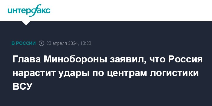 Москва. 23 апреля. INTERFAX.RU - Россия повысит интенсивность ударов по логистическим центрам вооруженных сил Украины и базам хранения западного оружия, заявил министр обороны РФ Сергей Шойгу.