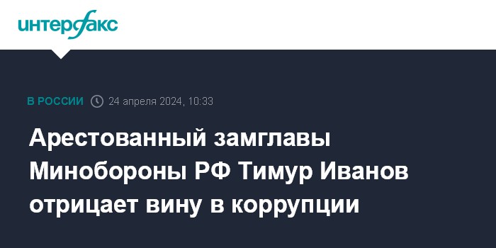 Москва. 24 апреля. INTERFAX.RU - Заместитель министра обороны РФ Тимур Иванов не признает вину в получении взятки, сообщил "Интерфаксу" источник, знакомый с ситуацией.