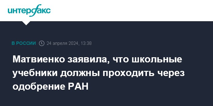 Москва. 24 апреля. INTERFAX.RU - Школьные учебники, в том числе по истории и математике, должны получать экспертное заключение Российской академии наук (РАН), без ее одобрения они не могут выходить в свет, заявила спикер Совета Федерации Валентина Матвиенко.