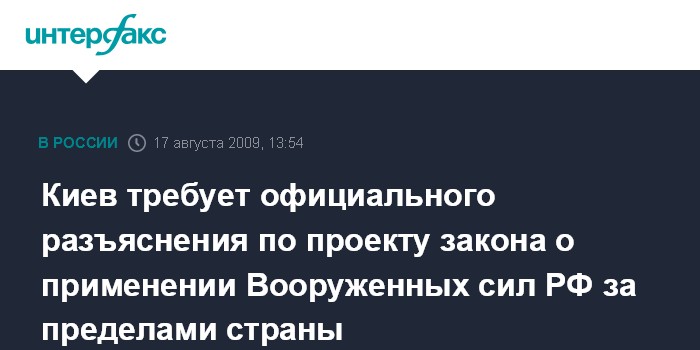 Москва. 17 августа. INTERFAX.RU - Министерство иностранных дел Украины поручило украинскому посольству в России получить официальное разъяснение от российской стороны по поводу инициированного президентом РФ Дмитрием Медведевым законопроекта о порядке применения Вооруженных сил России за пределами страны.