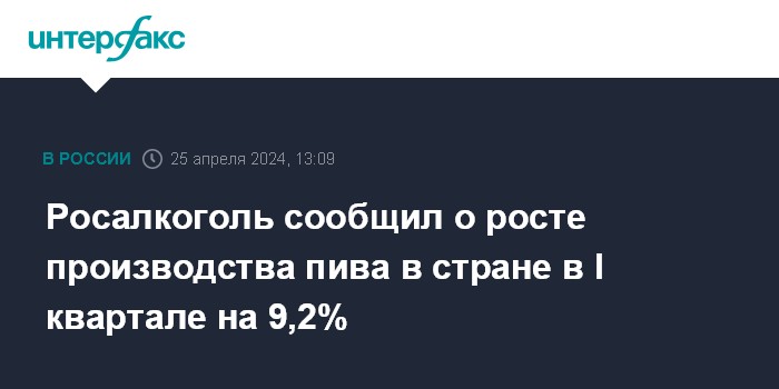 Москва. 25 апреля. INTERFAX.RU - В России в I квартале 2024 года было произведено 169,7 млн декалитров (дал), что на 9,2% больше, чем годом ранее, сообщает Росалкогольтабакконтроль.