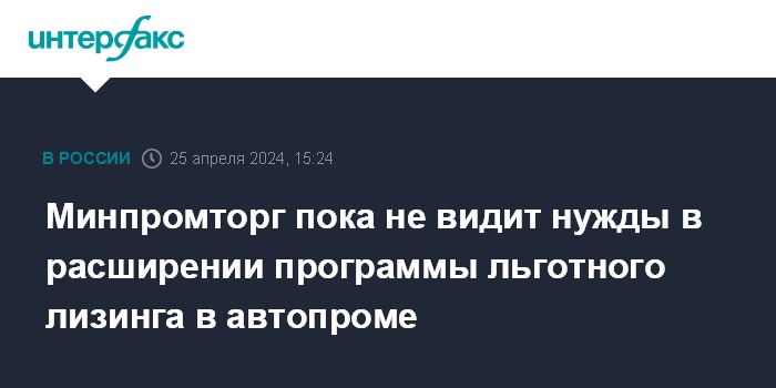 Москва. 25 апреля. INTERFAX.RU - Минпромторг России считает, что сейчас нет необходимости в дополнительной поддержке спроса на автомобильном рынке через расширение программы льготного лизинга в автопроме, заявил "Интерфаксу" в кулуарах съезда РСПП вице-премьер, глава Минпромторга Денис Мантуров.