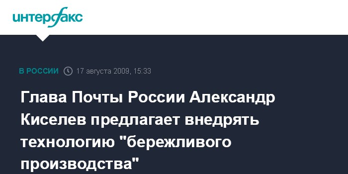 Москва. 17 августа. INTERFAX.RU – Технологии "бережливого производства" (так называемые lean-технологии) позволят реализовать часть мероприятий из Программы модернизации ФГУП "Почта России" без привлечения внешних средств, сообщил "Интерфаксу" генеральный директор предприятия Александр Киселев.