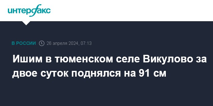 Москва. 26 апреля. INTERFAX.RU - Уровень воды в реке Ишим в селе Викулово (райцентр Викуловского района) в последние двое суток стал резко подниматься.