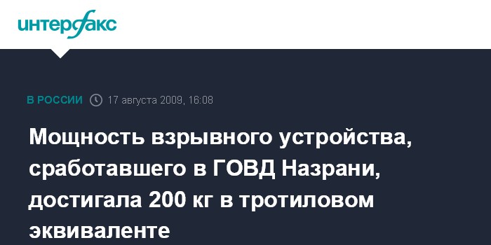 Москва. 17 августа. INTERFAX.RU - Мощность взрывного устройства, сработавшего в горотделе Назрани, составляла, по предварительным данным, порядка 200 кг в тротиловом эквиваленте, сообщил "Интерфаксу" в понедельник официальный представитель СКП РФ Владимир Маркин.