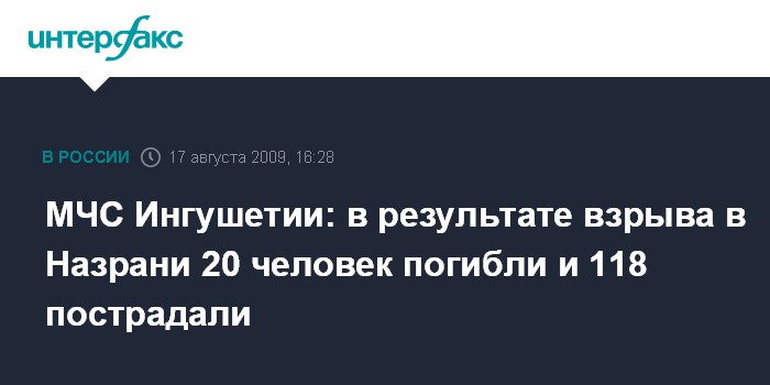 Москва. 17 августа. INTERFAX.RU - В результате взрыва у здания ГОВД в Назрани, по последним уточненным данным, 20 человек погибли, 118 получили ранения, среди них - 10 детей в возрасте от 5 до 12 лет, сообщил "Интерфакс-Юг" представитель пресс-службы МЧС Ингушетии.
