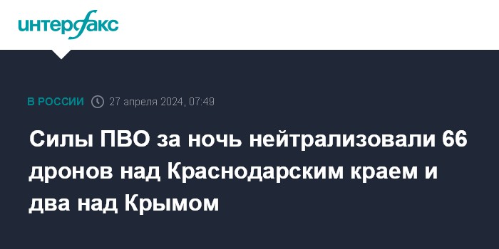 Силы ПВО за ночь нейтрализовали 66 дронов над Краснодарским краем и два над Крымом