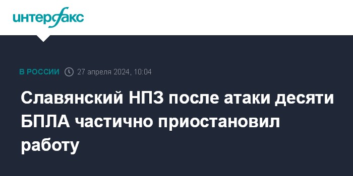 Москва. 27 апреля. INTERFAX.RU - "Славянский нефтеперерабатывающий завод" в Краснодарском крае после атаки беспилотников минувшей ночью частично приостановил работу, сообщил "Интерфаксу" директор по комплексной безопасности группы компаний "Славянск ЭКО" Эдуард Труднев.