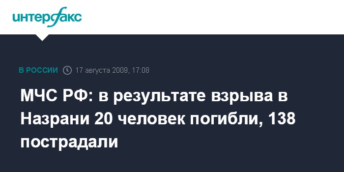 Москва. 17 августа. INTERFAX.RU - По последним данным МЧС России, в результате взрыва у здания ГОВД в Назрани 20 человек погибли, 138 получили ранения, сообщили "Интерфаксу" в понедельник в МЧС РФ.