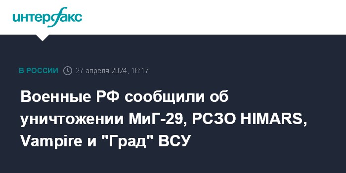 Военные РФ сообщили об уничтожении МиГ-29, РСЗО HIMARS, Vampire и "Град" ВСУ
