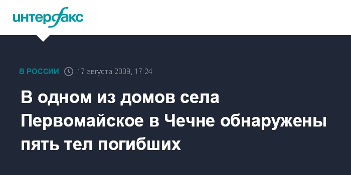 Москва. 17 августа. INTERFAX.RU - Тела пяти погибших обнаружены в одном из частных домов селения Первомайское в Чечне. "Во второй половине дня в понедельник в частном жилом доме селения Первомайское найдены пять тел погибших: двое мужчин и три женщины", - сообщили агентству "Интерфакс-Юг" в штабе Объединенной группировки войск на Северном Кавказе.