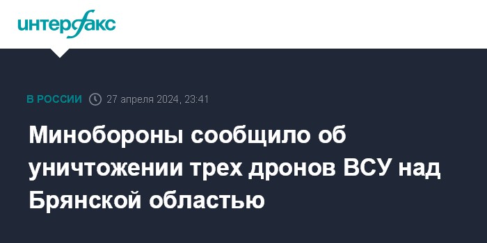 Москва. 27 апреля. INTERFAX.RU - Минобороны России сообщило, что средствами ПВО нейтрализовано три украинских дрона самолетного типа над Брянской областью.