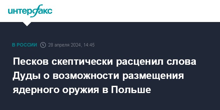 Москва. 28 апреля. INTERFAX.RU - Пресс-секретарь президента РФ Дмитрий Песков скептически расценил заявление президента Польши Анджея Дуды о возможности размещения ядерного оружия на территории этой страны, отметив, что оно направлено на запугивание населения стран Запада.