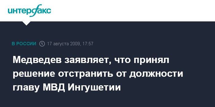 Москва. 17 августа. INTERFAX.RU - Президент России Дмитрий принял решение отстранить от должности главу МВД Ингушетии в связи с терактом в Назрани. "Сегодня я принял решение отстранить от должности министра внутренних дел Ингушетии, провести служебное расследование. А министр внутренних дел России должен представить мне конкретные предложения по наведению порядка и укреплению кадрового состава Министерства внутренних дел Ингушетии", - сказал Медведев в понедельник на совещании в Астрахани.