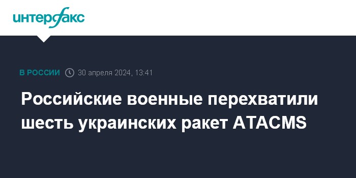 Москва. 30 апреля. INTERFAX.RU - Российские военные перехватили за сутки шесть украинских ракет ATACMS, уничтожили ангар для сборки легкомоторных ударных беспилотных самолетов ВСУ, сообщило Минобороны РФ во вторник.