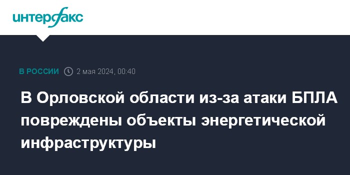 Москва. 2 мая. INTERFAX.RU - Объекты энергетической инфраструктуры на территории Глазуновского и Свердловского районов были повреждены в результате атаки БПЛА, сообщил в четверг губернатор Орловской области Андрей Клычков.