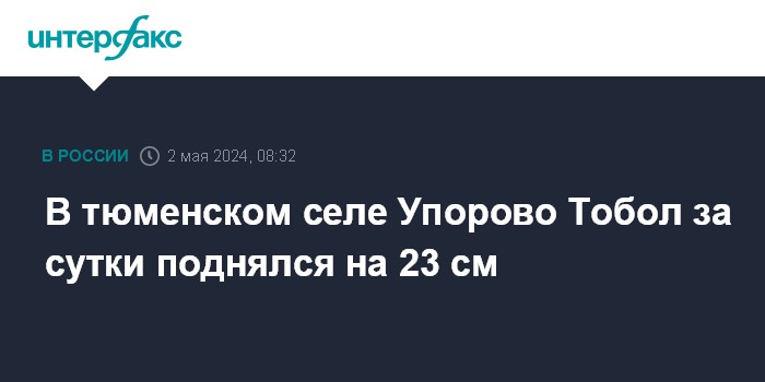 Москва. 2 мая. INTERFAX.RU - В Тюменской области уровень воды в Тоболе в селе Упорово (райцентр Упоровского района) поднялся к 8 утра по местному времени на 23 см до 846 см, сообщает информационный центр регионального правительства.