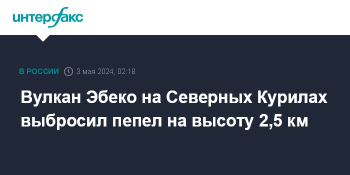 Москва. 3 мая. INTERFAX.RU - Вулкан Эбеко, расположенный на северокурильском острове Парамушир, утром в пятницу выбросил столб пепла на высоту 2,5 км над уровнем моря, сообщается на сайте камчатской группы наблюдения за вулканическими извержениями Института вулканологии и сейсмологии Дальневосточного отделения РАН.