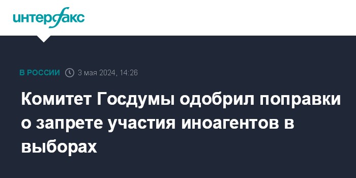 Москва. 3 мая. INTERFAX.RU - Комитет Госдумы по госстроительству и законодательству рекомендовал к принятию поправки о запрете иноагентам участвовать в выборах.