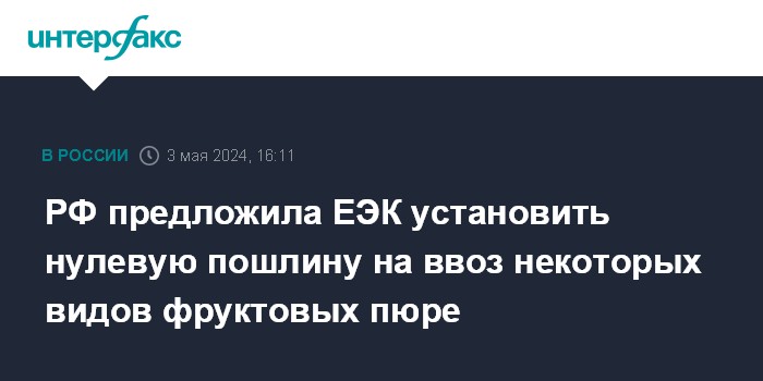 Москва. 3 мая. INTERFAX.RU - РФ направила в Евразийскую экономическую комиссию (ЕЭК) инициативное предложение об обнулении ставки ввозных таможенных пошлин на некоторые виды фруктовых пюре.