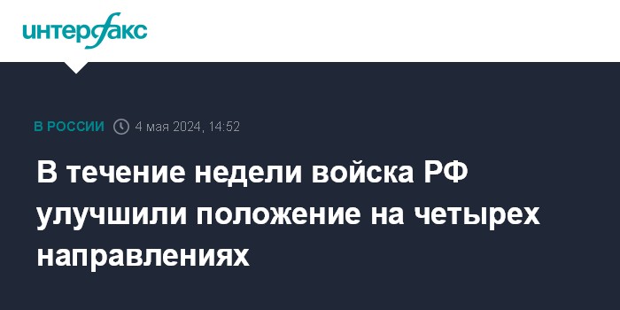 Москва. 4 мая. INTERFAX.RU - Российские группировки войск "Запад", "Юг", "Центр" и "Восток" за неделю улучшили свое положение, суммарно отразив почти сотню контратак вооруженных сил Украины (ВСУ), заявили в Минобороны РФ.