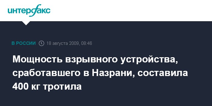 Москва. 18 августа. INTERFAX.RU - Мощность взрыва во время теракта в Назрани составила 400 кг в тротиловом эквиваленте, сообщил "Интерфаксу" во вторник источник в правоохранительных органах.