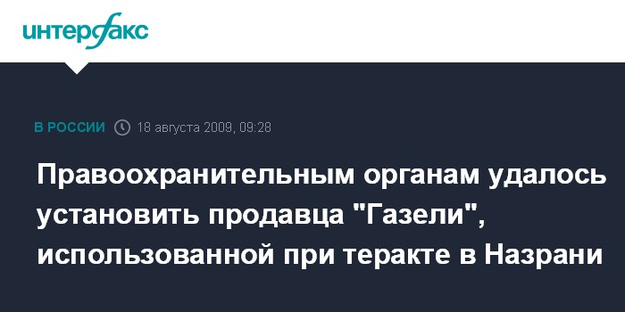 Москва. 18 августа. INTERFAX.RU - Личность хозяина, продавшего "Газель" боевикам, которые начинили ее взрывчаткой, а затем взорвали возле здания ГУВД Назрани, удалось установить.