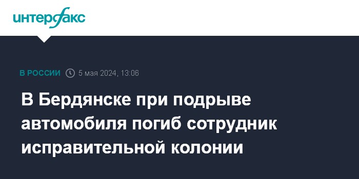Москва. 5 мая. INTERFAX.RU - Сотрудник исправительной колонии в Бердянске (Запорожская область) погиб в результате подрыва его автомобиля, сообщили в воскресенье в областном управлении СК РФ.