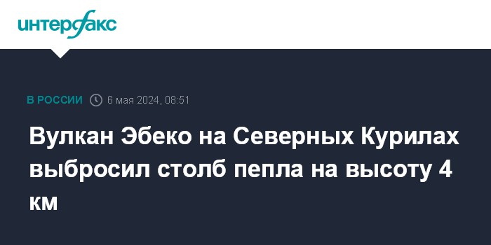 "6 мая 2024 года 16:12 камчатского времени (07:12 мск). Вулкан Эбеко. Высота пеплового выброса составила около 4 км над уровнем моря", - говорится в сообщении.