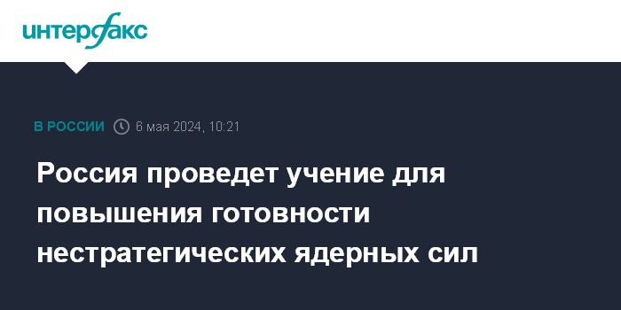 Москва. 6 мая. INTERFAX.RU - Министерство обороны России сообщило, что по поручению президента РФ Владимира Путина будет проведено учение с ракетными соединениями в целях повышения готовности нестратегических ядерных сил.