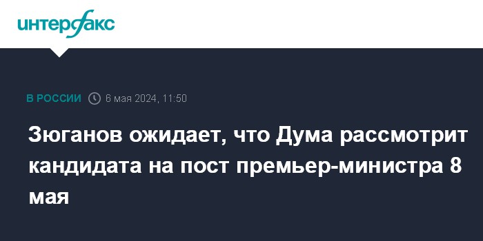 Москва. 6 мая. INTERFAX.RU - Госдума 8 мая рассмотрит вопрос об утверждении кандидатуры на должность премьер-министра, заявил председатель ЦК КПРФ Геннадий Зюганов.