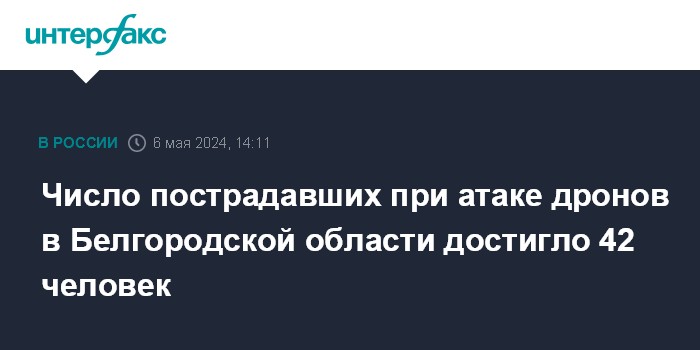 Москва. 6 мая. INTERFAX.RU - В результате атаки дронов ВСУ в Белгородской области 42 человека получили ранения, в том числе трое детей, четверо пострадавших находятся в тяжелом состоянии, сообщил в понедельник помощник главы Минздрава РФ Алексей Кузнецов.