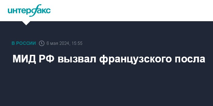Москва. 6 мая. INTERFAX.RU - В понедельник в МИД России был вызван посол Франции Пьер Леви, сообщила в своем телеграм-канале официальный представитель МИД РФ Мария Захарова.