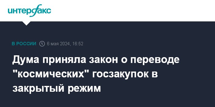 Москва. 6 мая. INTERFAX.RU - Госдума РФ приняла во II и III чтениях проект поправок №532929-8 к закону "О контрактной системе" (44-ФЗ), согласно которым госкорпорация "Роскосмос" будет осуществлять свои закупки закрытыми конкурентными способами.