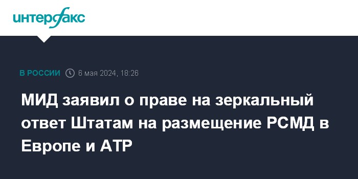 Москва. 6 мая. INTERFAX.RU - США встали на путь размещения в различных регионах комплексов РСМД, в случае их появления где бы то ни было Россия оставляет право ответить зеркально и прекратить действие одностороннего моратория на размещение таких систем, заявили в МИД России, комментируя анонсированные учения ядерных сил.