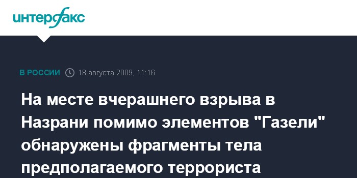 Москва. 18 августа. INTERFAX.RU - На месте взрыва в ГОВД Назрани обнаружены фрагменты тела, которые могут принадлежать террористу-смертнику.