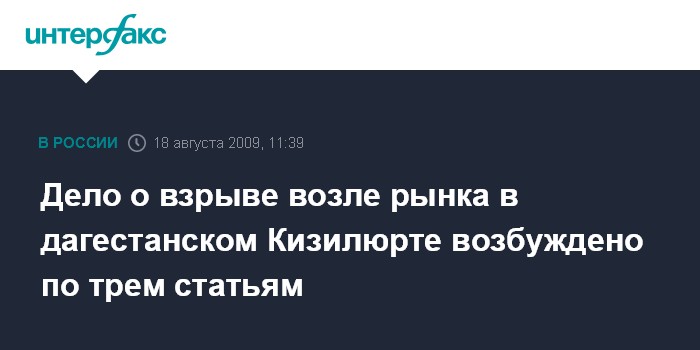 Москва. 18 августа. INTERFAX.RU - По факту взрыва в Кизилюрте (Дагестан) возбуждено уголовное дело, говорится в сообщении, размещенном во вторник на официальном сайте СКП РФ.
