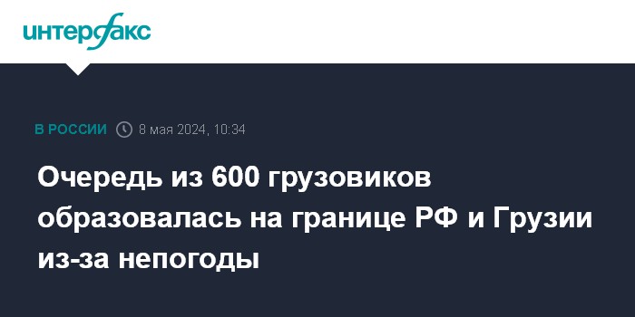 Москва. 8 мая. INTERFAX.RU - Более 600 грузовых автомобилей стоят в очереди на проезд через границу РФ и Грузии с российской стороны к утру среды, сообщили "Интерфаксу" в пресс-службе МВД по Северной Осетии.