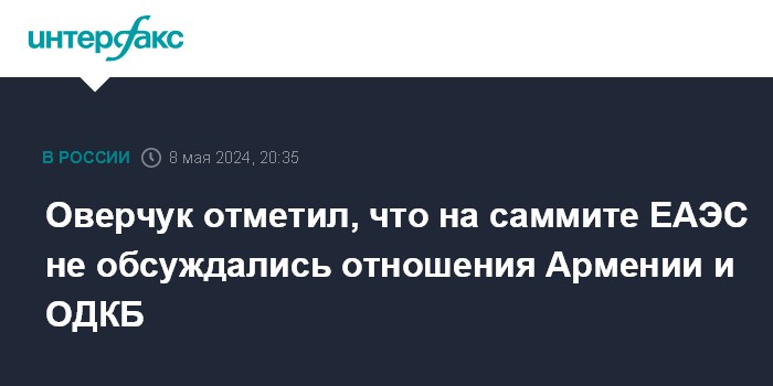 Москва. 8 мая. INTERFAX.RU - Вопросы взаимодействия Армении с ОДКБ на саммите ЕАЭС в Кремле в среду не обсуждались, речь шла только об экономическом сотрудничестве государств ЕАЭС, сообщил журналистам и.о.вице-премьера РФ Алексей Оверчук.