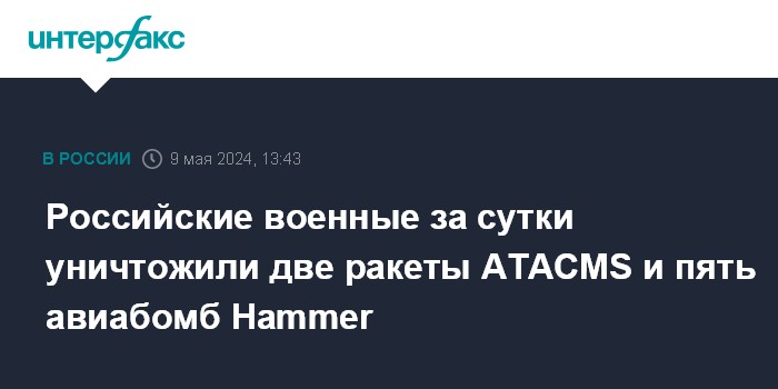 Москва. 9 мая. INTERFAX.RU - Российские военные заявили о перехвате за сутки двух украинских ракет ATACMS, пяти авиабомб Hammer и 28 дронов, ударе по полевому складу боеприпасов оперативно-тактической группы "Донецк" армии Украины.