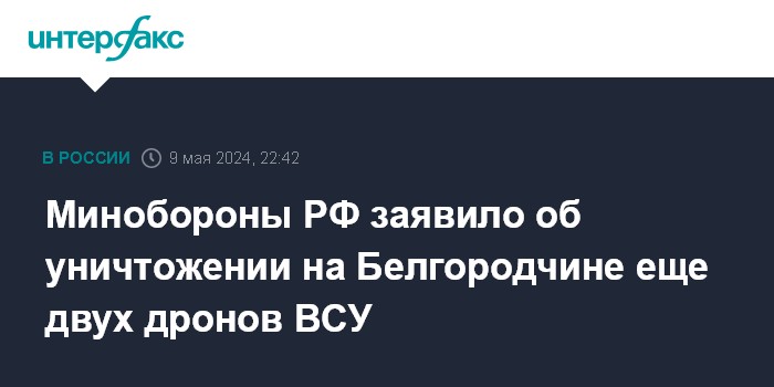 Москва. 9 мая. INTERFAX.RU - Российские военные сообщили, что в четверг вечером сбили над Белгородской областью еще два украинских дрона самолетного типа.